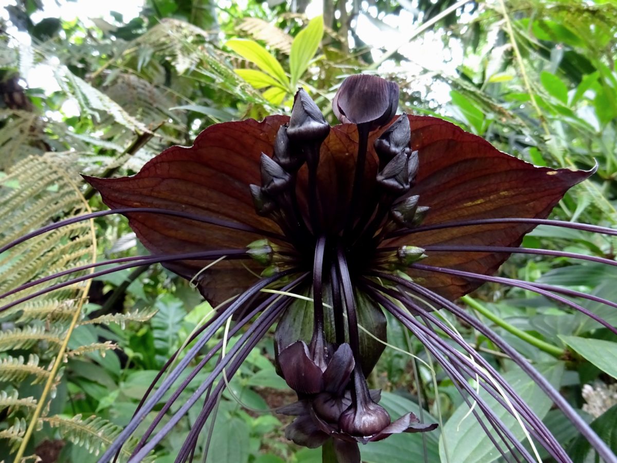 Black bat plant (Tacca chantrieri) looks like a winged demon spewing strings of bile from its face, which is to say this plant is stunning. With blackish purple flowers 12” across, it’s easily the most emo member its large family (the Dioscoreaceae, which includes yams), even if it’s a bit on-the-nose as a heavy metal houseplant.