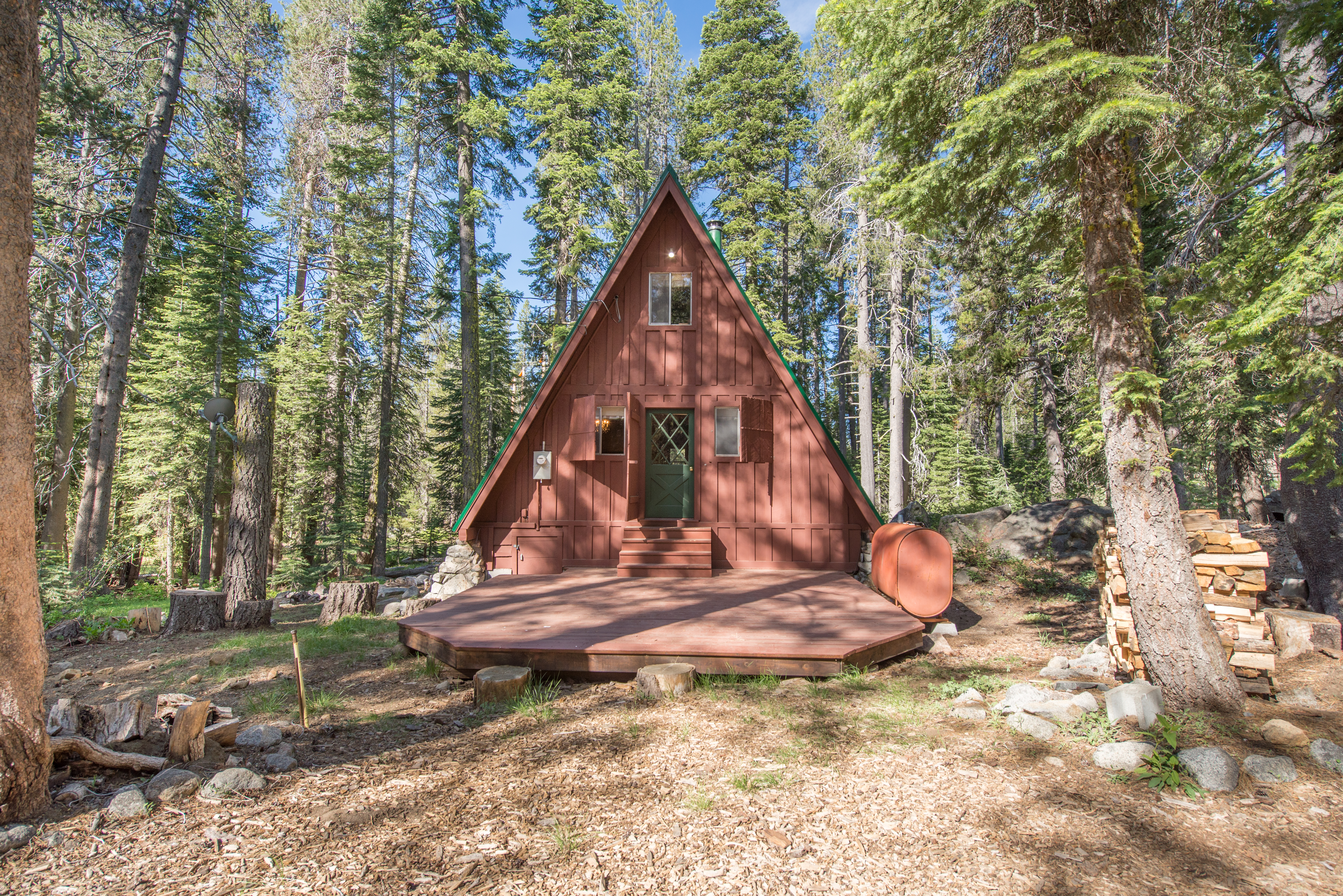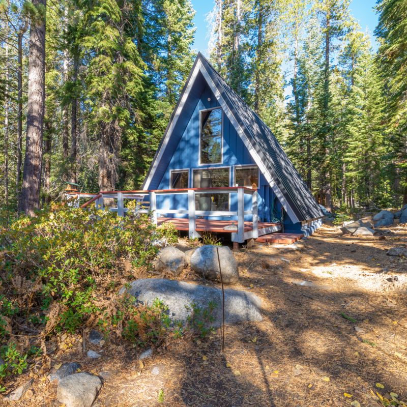 Just across the street from the Yuba River and twenty minutes from downtown Truckee, this two-bedroom A-frame is an eye-catcher with its blue exterior in the midst of the forest. Plus, it’s just minutes away from Tahoe ski resorts, making it a great retreat in the snowy season.