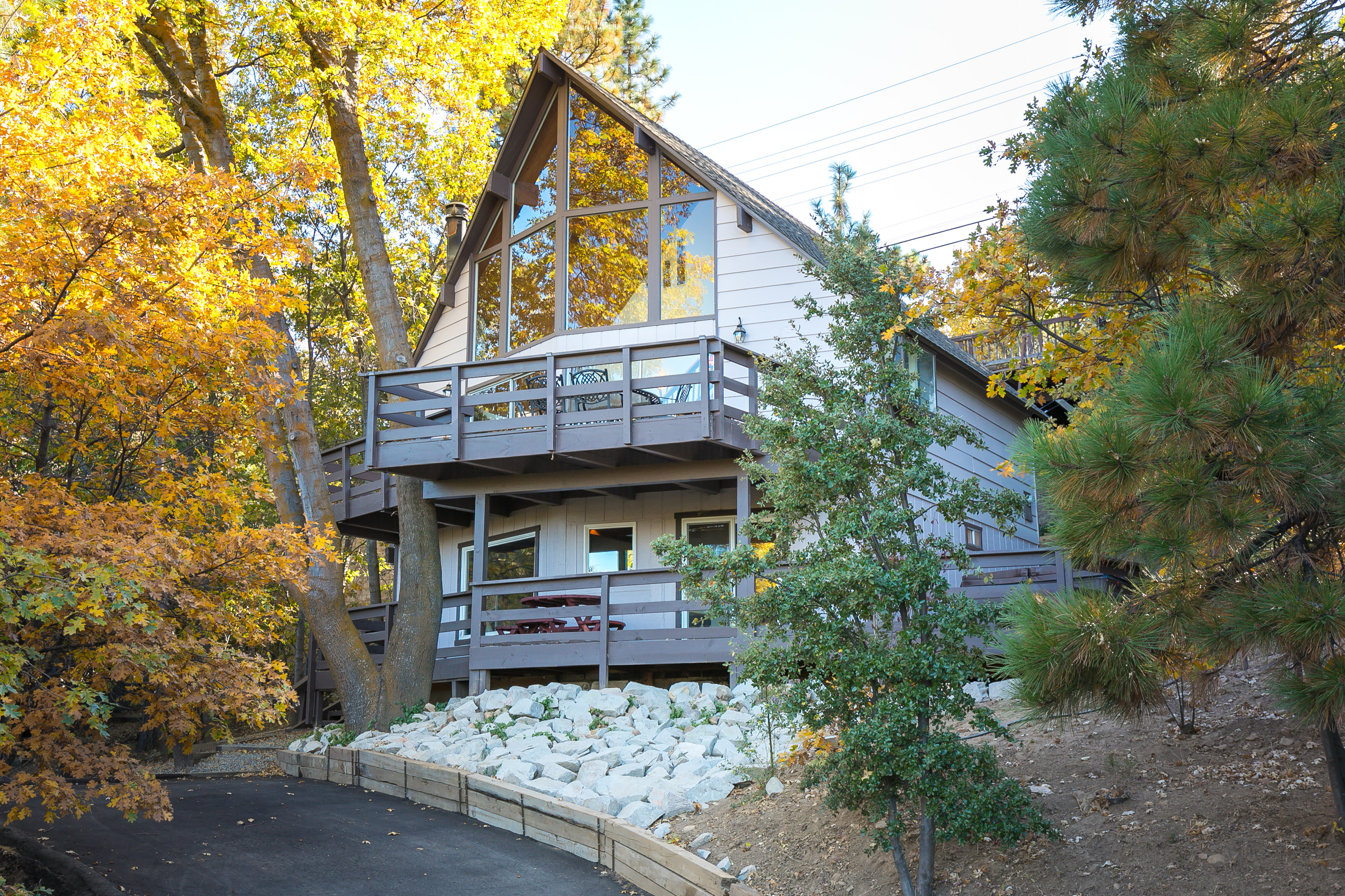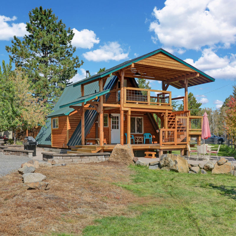 This A-frame makes a major statement with a vaulted cover for the two-story deck that matches the roof of the home. Located near the Deschutes River Woods with amenities like heated bathroom floors, several outbuildings, a shed, and RV parking, the home sits on a fully-fenced 1.63 acres with multiple fruit trees and landscaping.