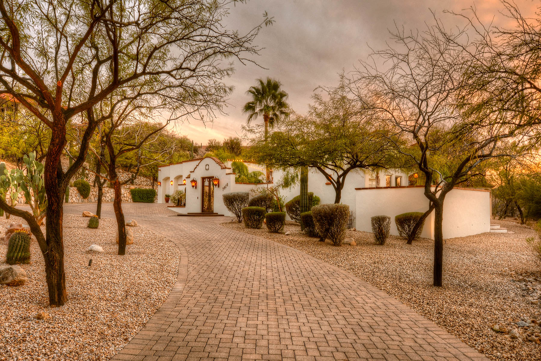 This palatial estate packs major curb appeal with an arched entryway, leading into a tree-lined courtyard with a stone fountain. The Tucson home has five bedrooms along with a pool, jacuzzi, putting green, and three-car garage on a 1.13 acre lot.