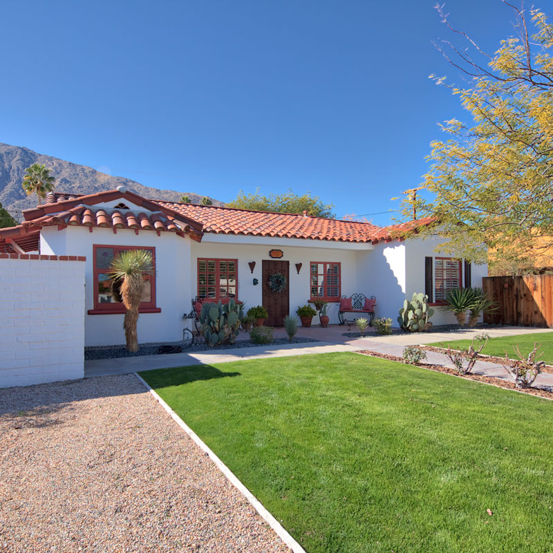This 1937 Spanish Colonial stunner is just a short stroll from downtown Palm Springs. The two-bedroom home features eye-catching Saltillo tile floors and stained glass windows, along with stone fireplaces in both the living room and the master bedroom, and views of  Mt. San Jacinto from the backyard.