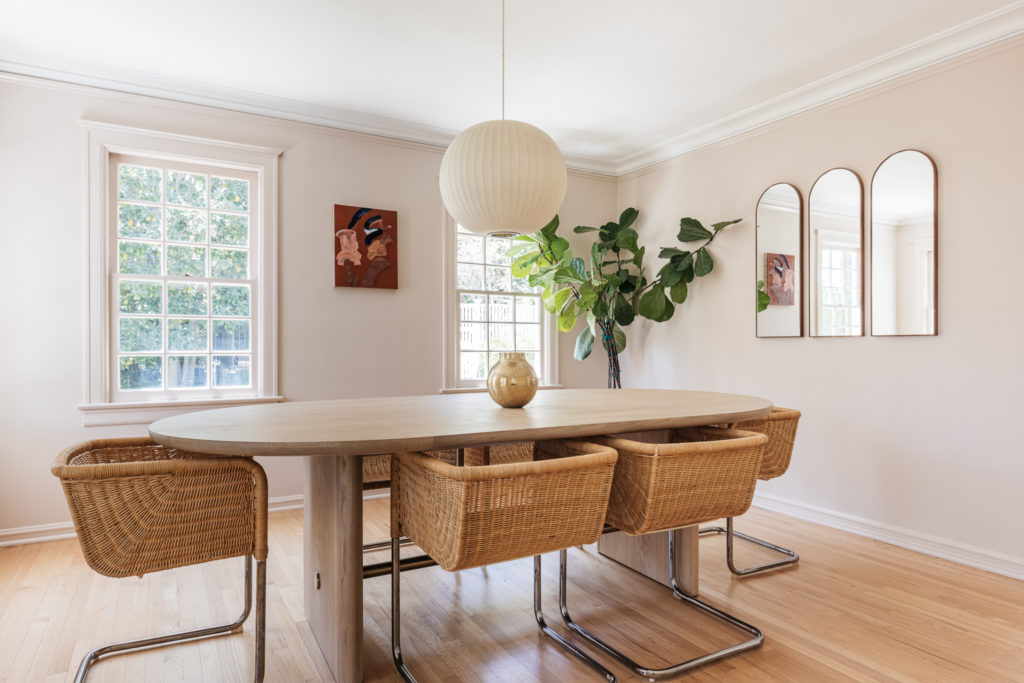 The wavy lines and smooth edges theme continues in the attached dining room. Aside from the original paned windows, there are no right angles. The dining table is oblong, the mirrors are arched and the Harvey Probber cantilevered chairs are all curves.