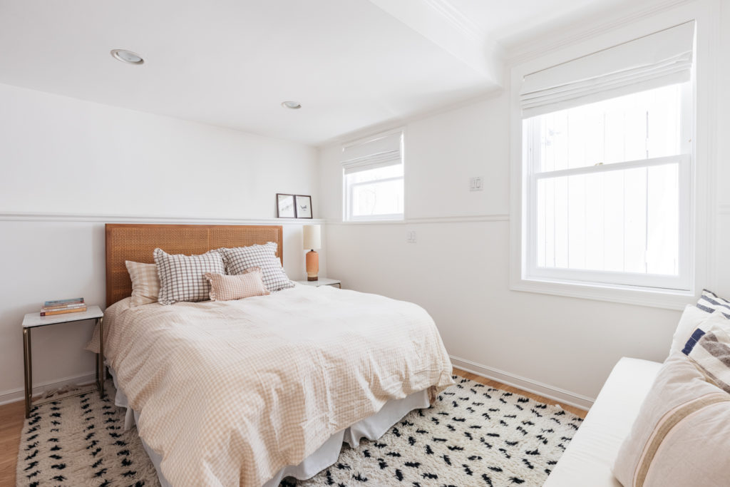 A sparsely furnished first-floor bedroom still feels cozy and warm, thanks to the addition of Heather Taylor Home bedding and a plush Moroccan rug.