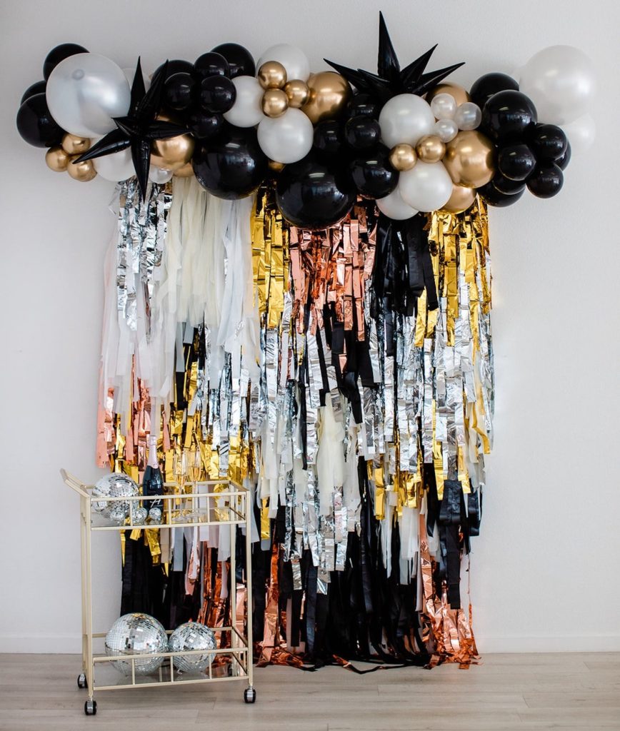 If you’re cutting it close on time, head to Etsy. Many shops have a variety of backdrops or backdrop kits that could match your vibe. If you’re looking for glitz and glamour, order a sequin wall from BlushBloomsDecor. The sequins come in different colors ranging from rose gold to iridescent silver. The wall is a show-stopper and the perfect accessory for a New Year’s Eve photo backdrop.