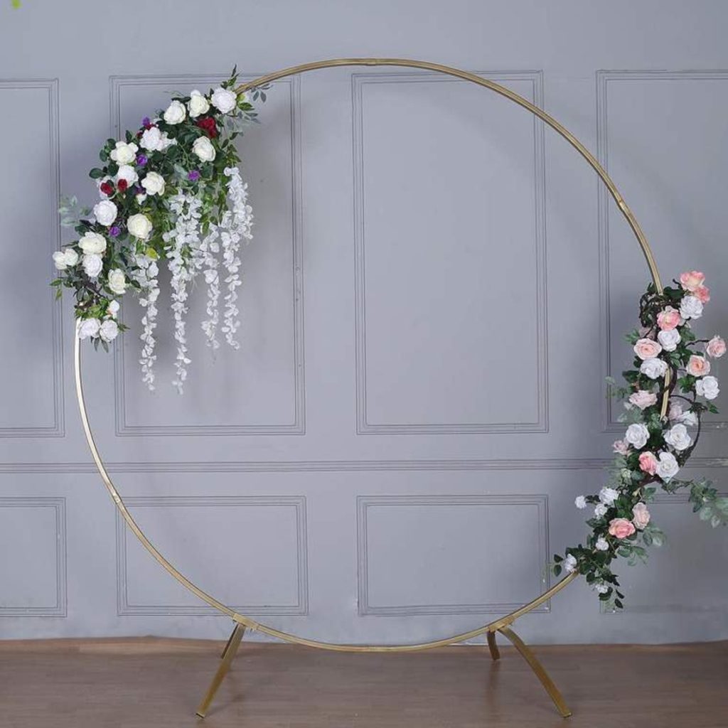 You can take your booth to the next level by adding a large structure. This gold arch from EfavormartBoutique will transport your guests with its mesmerizing design. You can create your own twist by adding balloons and flowers of your choice. EfavormartBoutique also offers a wooden arch in a hexagon shape that offers a bohemian-type feel.