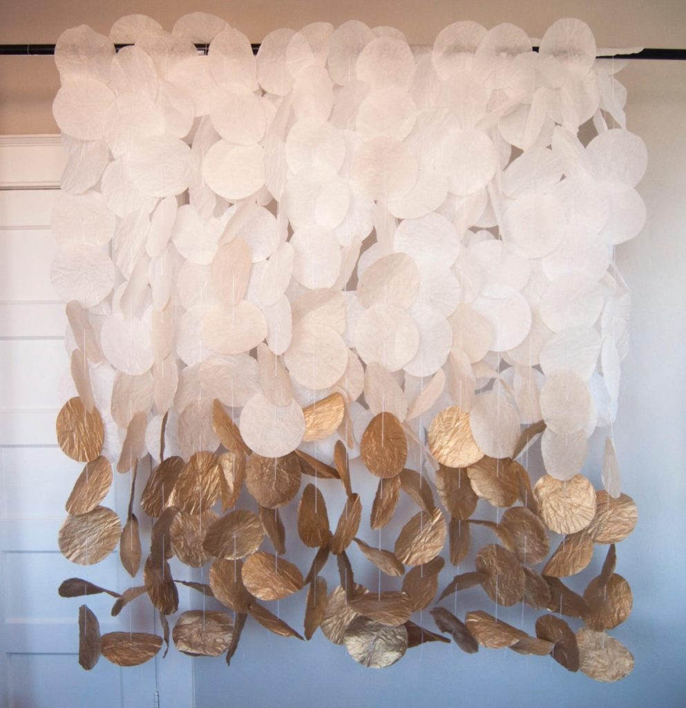 Keeping up with the sparkle, you can buy a fringe backdrop from OhMyDarlingPartyCo. Even though the backdrop appears to have various depths of gold, bronze, and silver, it comes in one piece with a plastic backing that is easily hung.