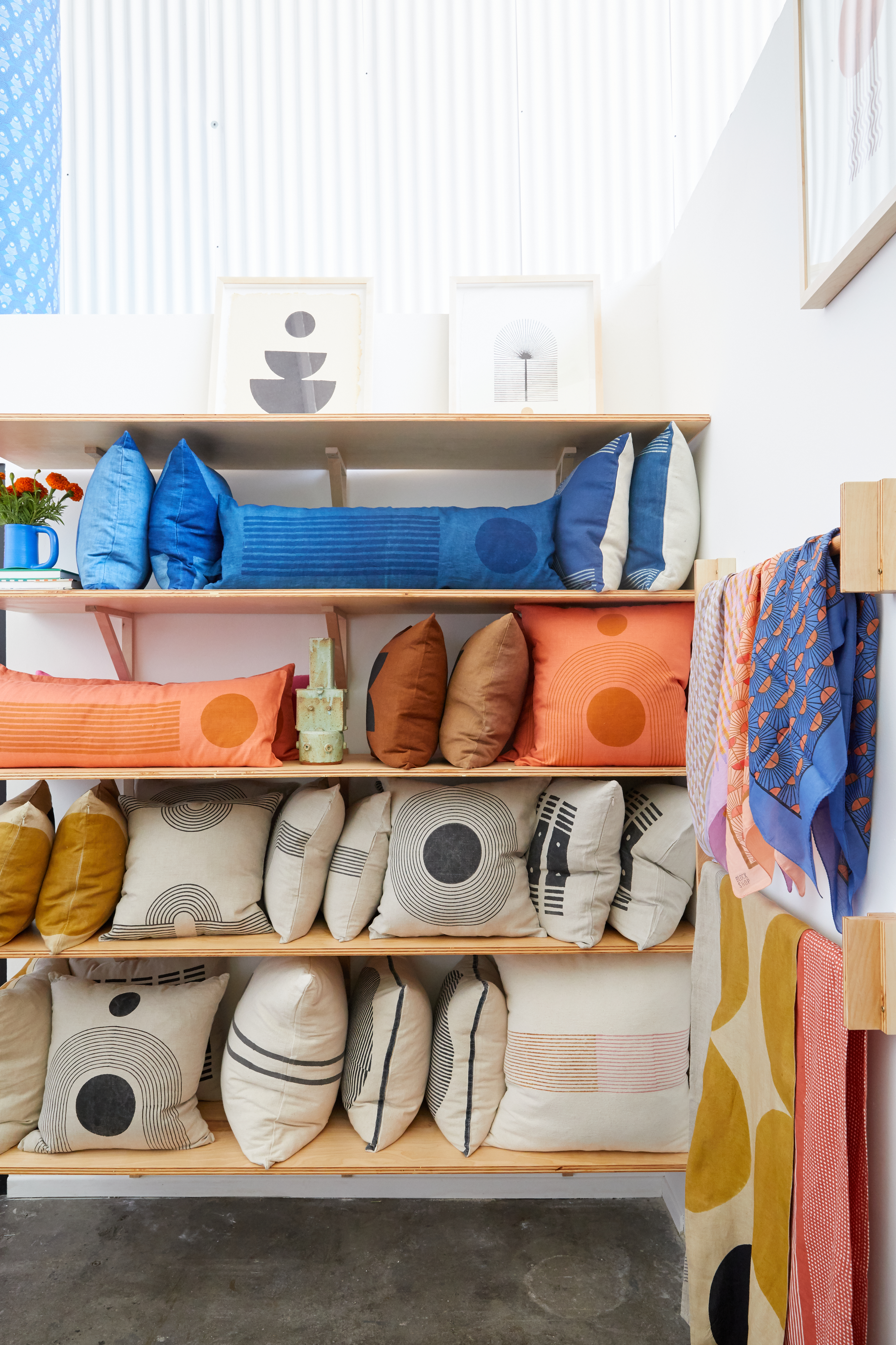 Interact with Block Shop’s variety of colorful, printed pillows.