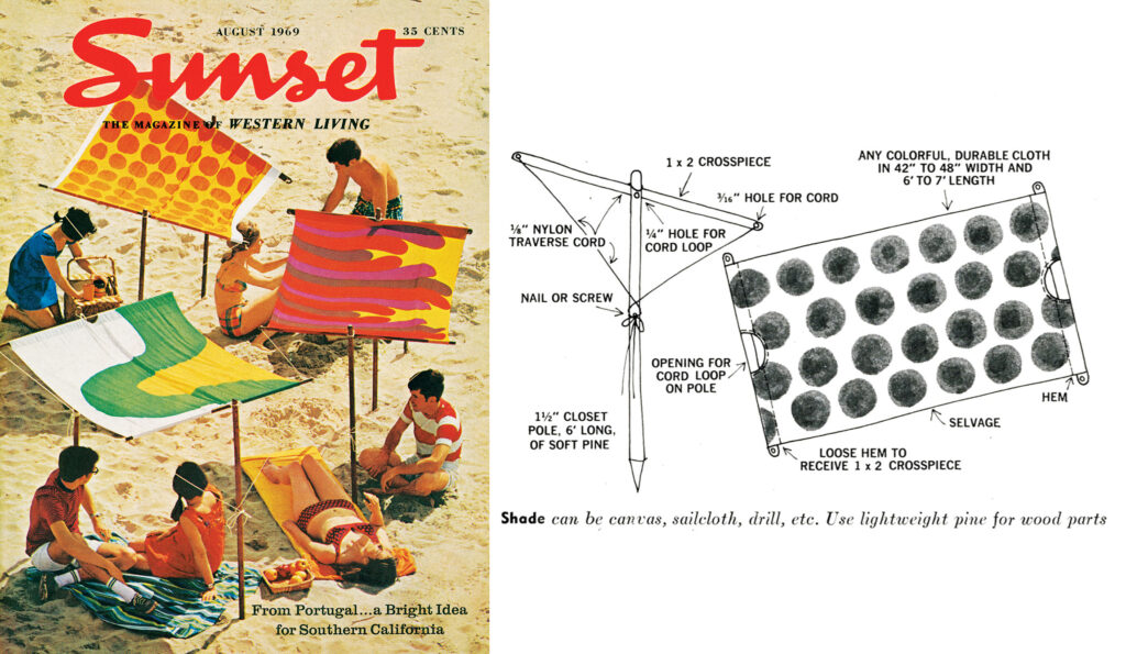 Back in August 1969, a pair of Sunset editors on vacation in Portugal were so inspired by the colorful wood-and-canvas beach shades they saw on the island of Porto Santo that they decided to share them as a DIY project with the magazine’s readers upon their return. Although they ended up on this iconic cover that perfectly captures an idyllic mid-century SoCal summer, Madeira-style shades never quite took off in the states.