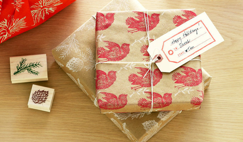 Style your own gift wrap with stamps and colored ink. Try taking Kraft paper and adding wintery stamps, like these from Yellow Owl Workshop. Plus, kids will love wrapping with you when it involves stamping.