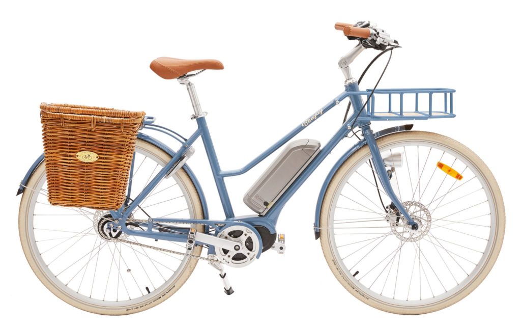 The design is reminiscent of a beach cruiser but with all the bells (literally) and whistles like a rear rack that can hold a 55-lb child seat, a wheel lock to prevent theft, Shimano Alfine 8 internal gear hub, Tektro hydraulic disc brakes, leather seat and handles, plus an adorable rattan basket.