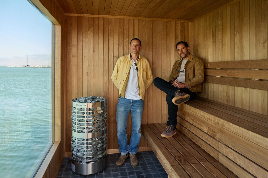The sleepy seaside hamlet of Sausalito has historically been known for its unique houseboat community and stunning views of the San Francisco Bay. Though it’s right over the Golden Gate Bridge and offers proximity to the city, Sausalito’s slower ebb and flow has drawn free thinkers like Alan Watts and Shel Silverstein. It’s even inspired one of America’s classic rhythm and blues tunes; Otis Redding famously wrote his song Sittin’ on the Dock of the Bay after making the docks his home. And now, an inspired concept is gracing the shores of the Sauso waterfront. Called Fjord, the floating sauna and cold plunge blends the Nordic tradition of contrast therapy, also known as Viking Cycling, with a modern, design-forward seaside space.