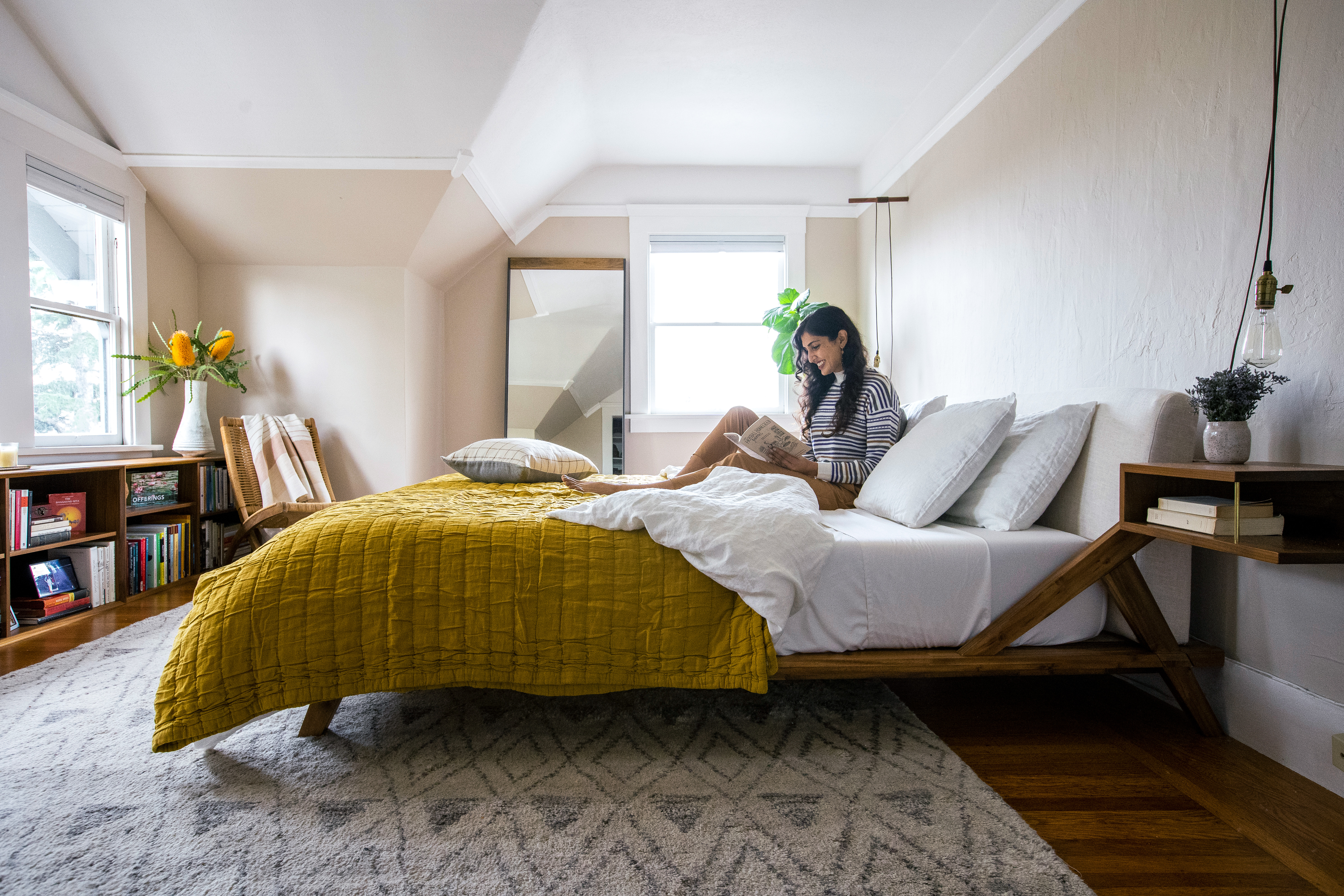 When revamping the Oakland home of Ayurvedic practitioner Sachi Doctor (pictured), Jung relied on textures and an understated palette for a soothing space. “I regularly recommend linen bedding, because it’s a breathable fabric that keeps you cool in the summer and warm in the winter,” she says.