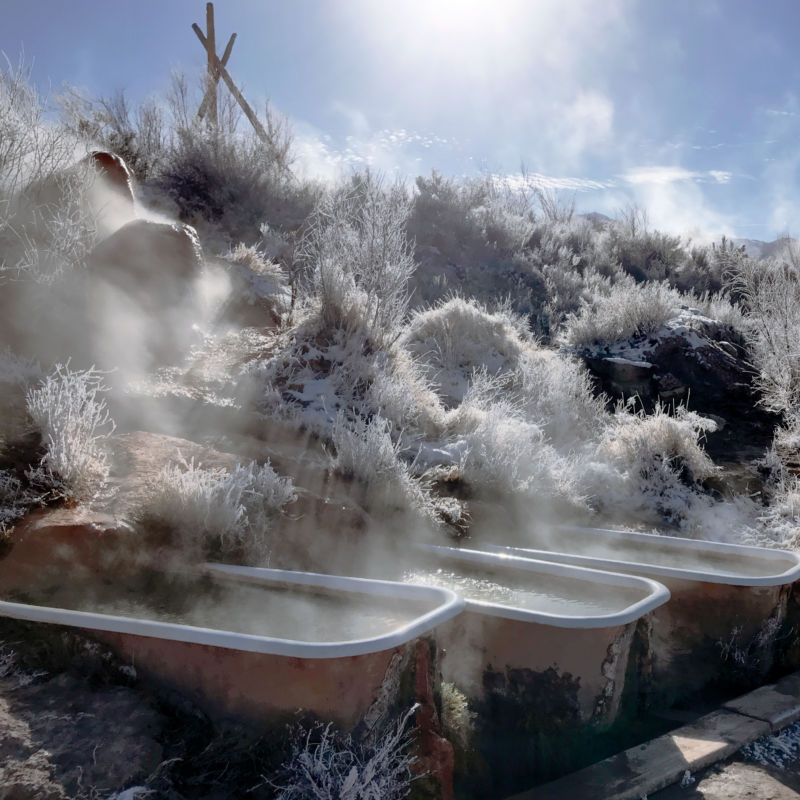 The Draw: This 19th-century homestead turned rustic hot springs retreat has a hippie-dippy, free-spirited vibe (the owner is a Deadhead). A 24-hour soaking area consists of two concrete pools—one with a waterfall—and six vintage cast-iron bathtubs with waters hovering between 99 and 110°.