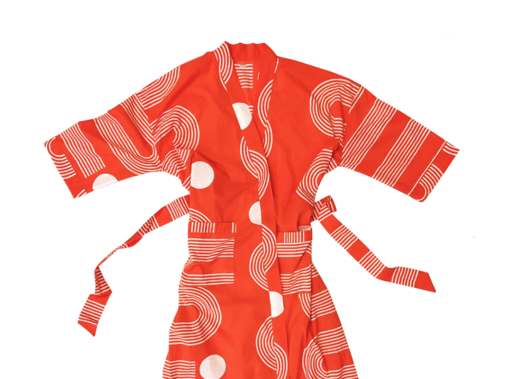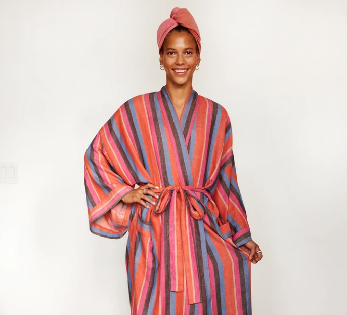 These soft, richly-hued, 100% cotton robes are ethically handwoven in small batches in partnership with a fair trade organization that works with artisan cooperatives across India. The unisex style is striped in beautiful colors and features a drop sleeve, but each one is unique, so expect slight variations in style and color.