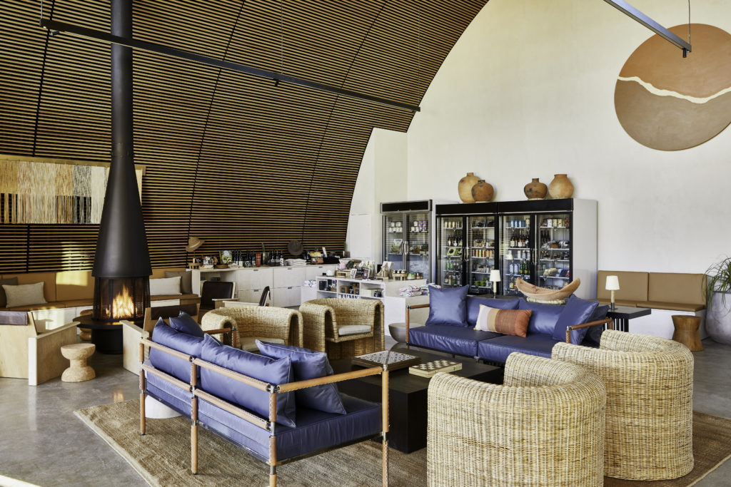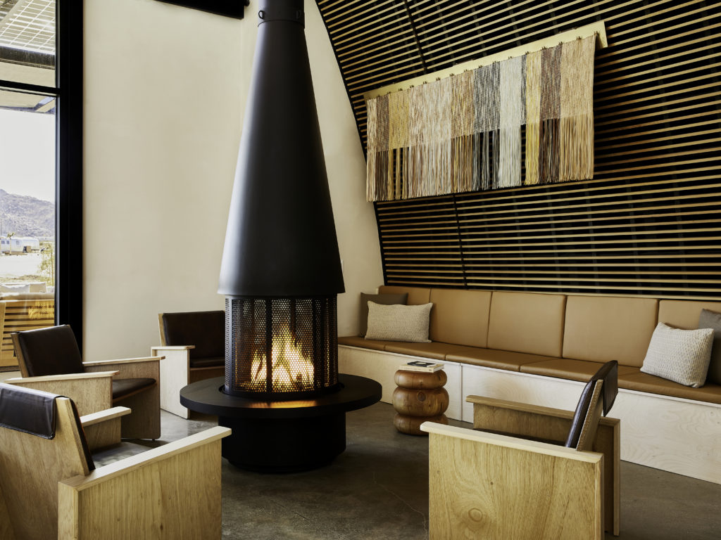 Should you need anything during your stay, or simply want to lounge indoors, the clubhouse will be open 24-7. Bay Area designer Alexis Moran created custom indoor plywood lounge chairs with “wide armrests to set a drink” and “comfortable leather cushions for relaxing around the fireplace,” Niehenke says. Stools and tables by Joshua Tree designer Dan John Anderson complete the look.