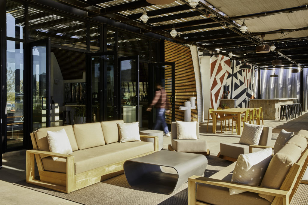 More possibilities abound thanks to the desert’s temperate climate. On an outdoor deck, sculptural, woven resin-wicker lounge chairs from Los Angeles-based Fong Brothers Co. are “meant for sunbathing and stargazing,” says Shannon Niehenke, principal of San Francisco-based Narrative Design Studio. Niehenke’s interior design firm brought together furniture and custom artwork from makers up and down the West Coast for the clubhouse created by the architectural design firm HKS.