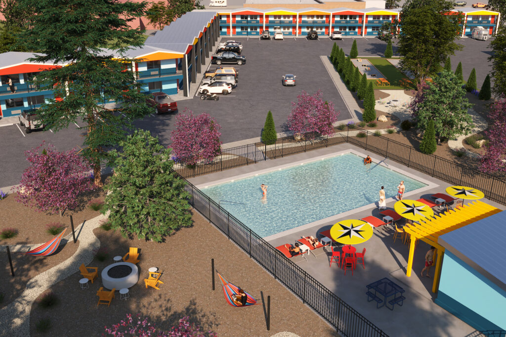 Americana Motor Hotel recently reopened in Flagstaff, Arizona, following an extensive renovation and rebrand by Practice Hospitality. Built in 1962, the motel is set in the world’s first Dark Sky city, and within a short distance of the Grand Canyon and the Sunset Crater Volcano. The retro-futuristic oasis is a reimagining of the classic roadside retreat. Designed by Andrew Alford, the vibrant, colorful property promises pure joy.