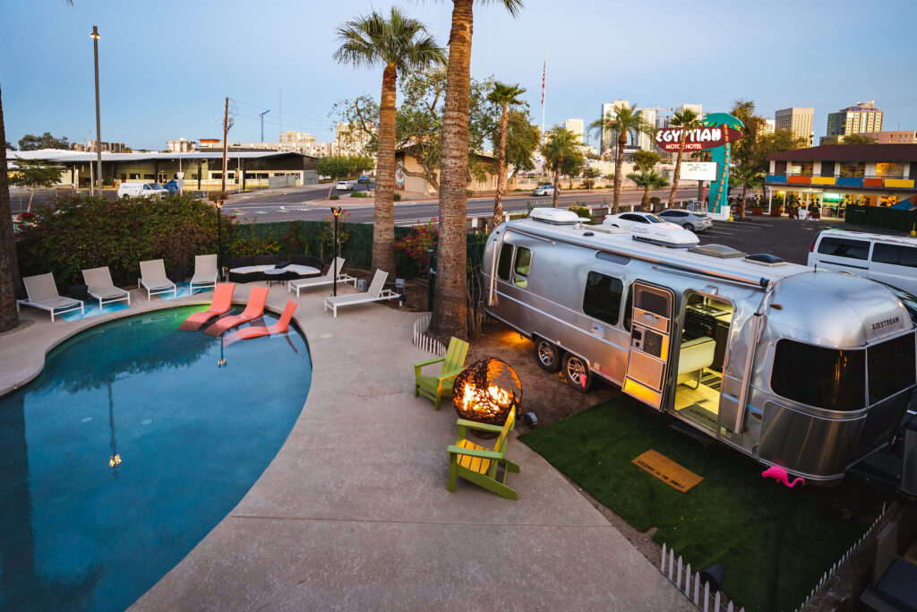 The Egyptian Motor Hotel has been in Phoenix’s vibrant Arts District for over 70 years, and has recently been resurrected as one of the coolest boutique hotels that Arizona has to offer. Now, the property has 49 retro modern rooms with bunk beds (aka “stacked”) and King bed offerings, as well as an Airstream guest room stocked with throwback amenities like Marshall Bluetooth speakers and retro refrigerators. Outside, you’ll find firepits, where you can strum the complimentary acoustic guitars that come in each guest room. There’s also a 250-seat entertainment venue (pro tip: You can actually watch performances from your balcony) and a culinary program helmed by the beloved Mexican pop-up Chilte, their first brick-and-mortar location.