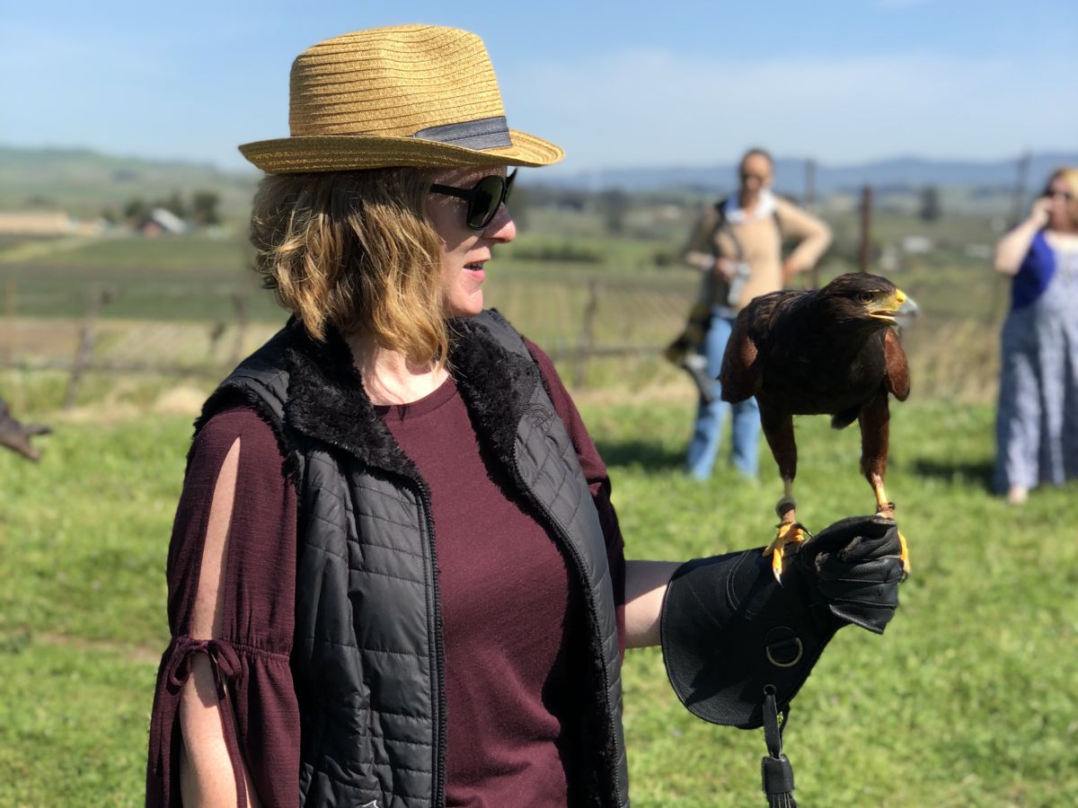 Bouchaine winemaker Chris Kajani holds falcon Mariposa. You can learn how the falcons mitigate damage from birds and rodents at the Napa Valley winery.