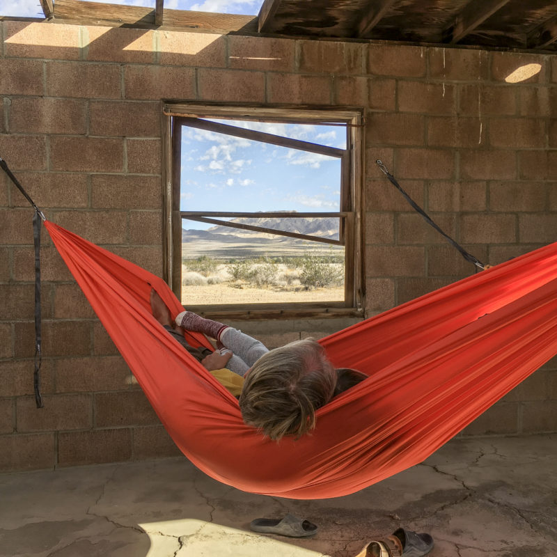 That breakaway feels total when you can’t see another soul with your naked eye from anywhere on his property. Out here, there’s a feeling of simplification. There’s no complicated calculus to do in the extreme desert when it’s 100 degrees—except staying cool and hydrated, and thinking about who you really are when everything else is stripped away but the need to survive the afternoon. It’s that hot. In May. Because it’s so simple, he says people are afraid to stay out in the desert alone, and need some kind of tether to civilization, which he offers.