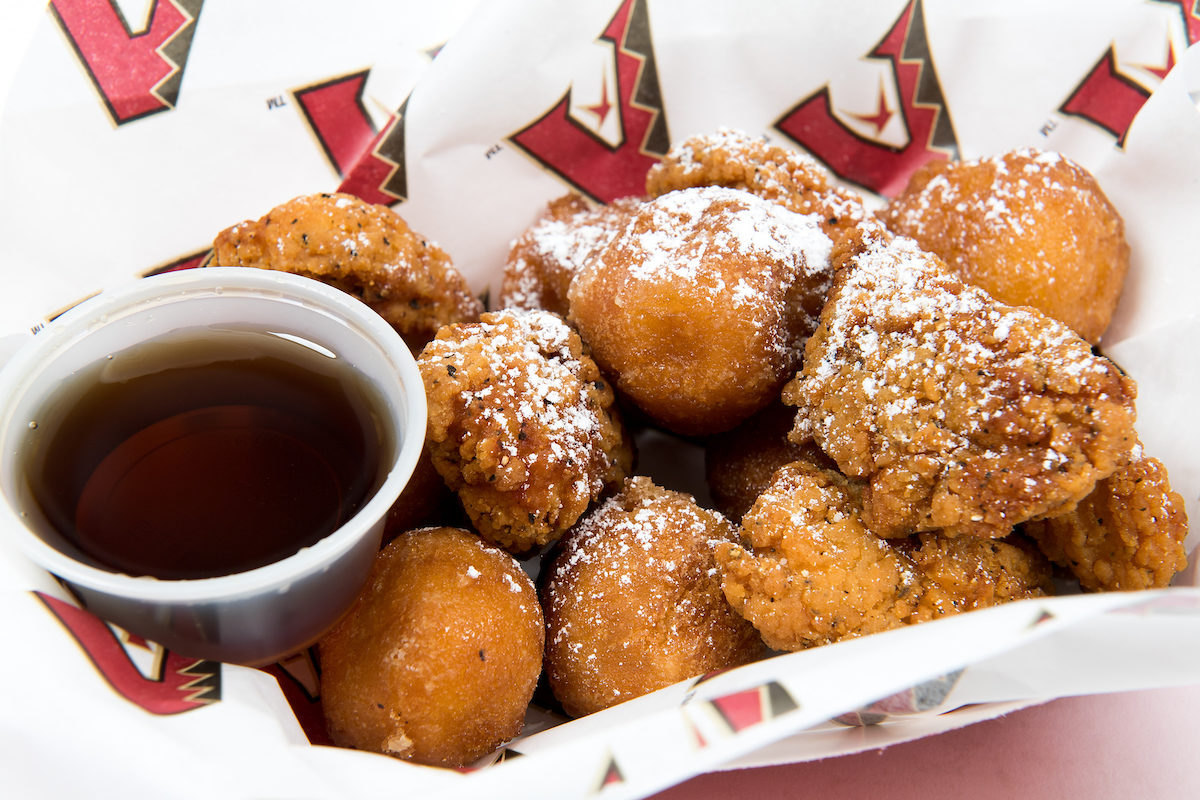 D-backs fans do not lack for over-the-top menu items. Highlights include: 18-inch (for sharing, we assume?) hot dogs with toppings like hash browns, fried eggs, mac ‘n’ cheese, and house-cured beer pickles; chicken and doughnuts; fry-bread tacos; a strawberry cheesecake shake, and Hatch Valley cheesesteaks. If any healthier-minded fans wander in, they can eat Mediterranean vegan wraps and, of course, plant-based burgers.