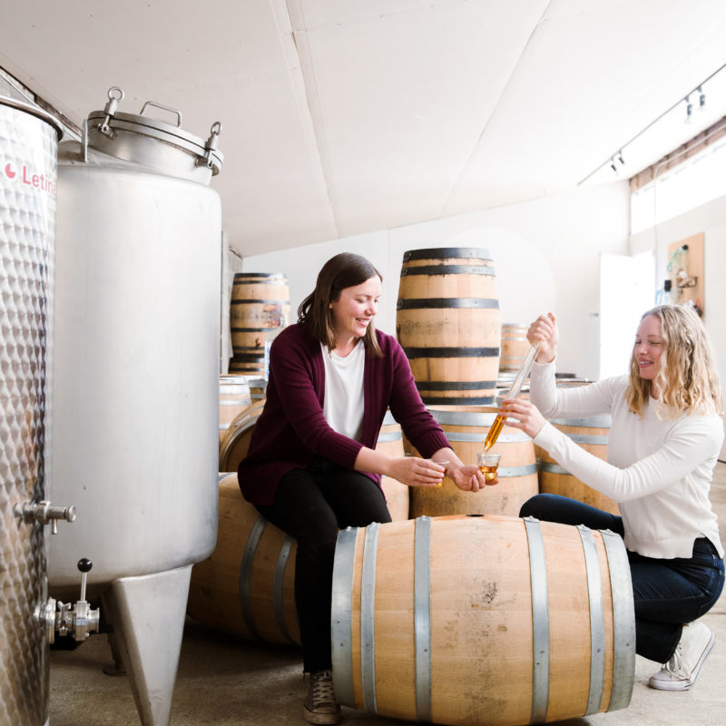 Sam Blatteis (right) from Home Base Spirits uses a “thief” to draw whiskey from a barrel for her sister Ali Blatteis in their Berkeley workspace.