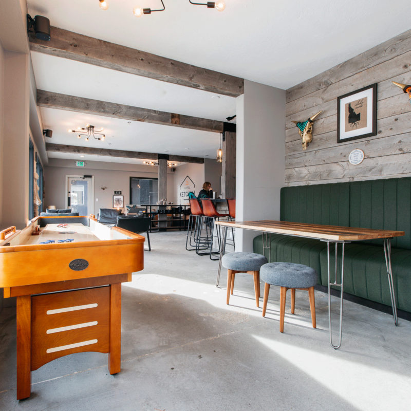 Located in the lobby of the Hotel Ketchum—actually, it is the lobby of Sun Valley’s Hotel Ketchum—The Hangout is as laid-back as it sounds. The space sprawls across several seating areas so those watching football or playing a cutthroat game of table shuffleboard won’t bother the party recharging with a book and a complimentary afternoon cookie.