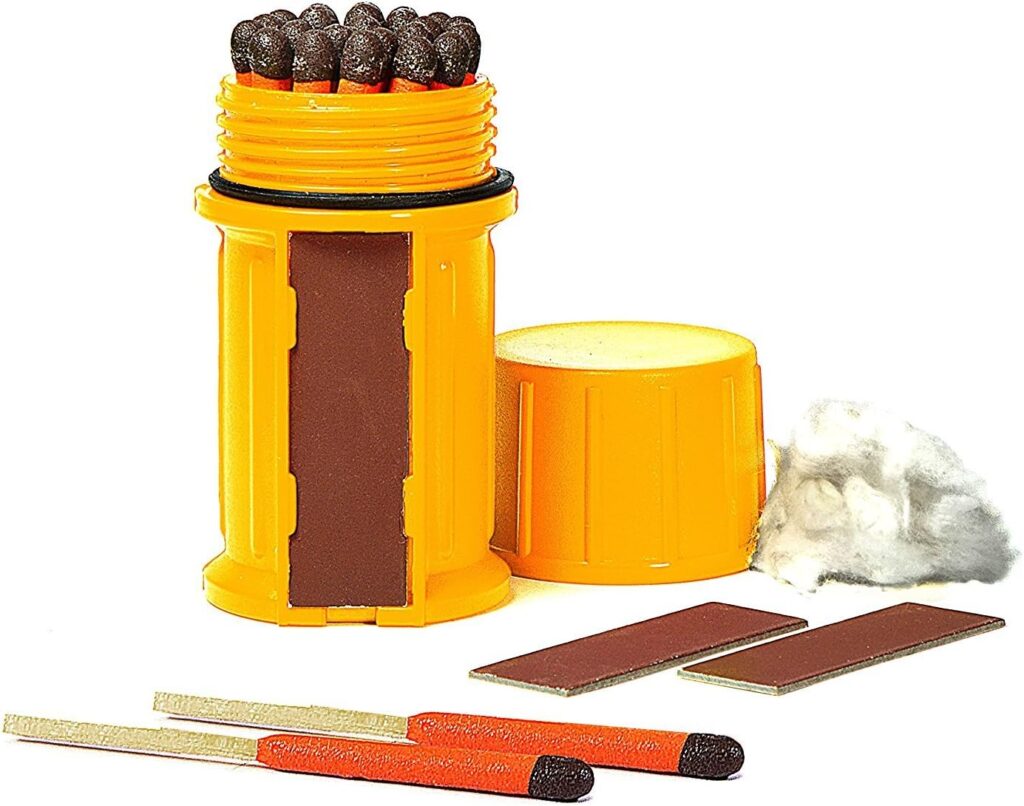 Stormproof Matches are windproof and waterproof. They also light up quickly and consistently in driving rain, heavy winds, and falling snow with a burn time of up to 15 seconds. Plus, they will relight after being submerged in water. Each kit includes 25 Stormproof Matches, three strikers, and a cotton ball inside a waterproof case that floats.