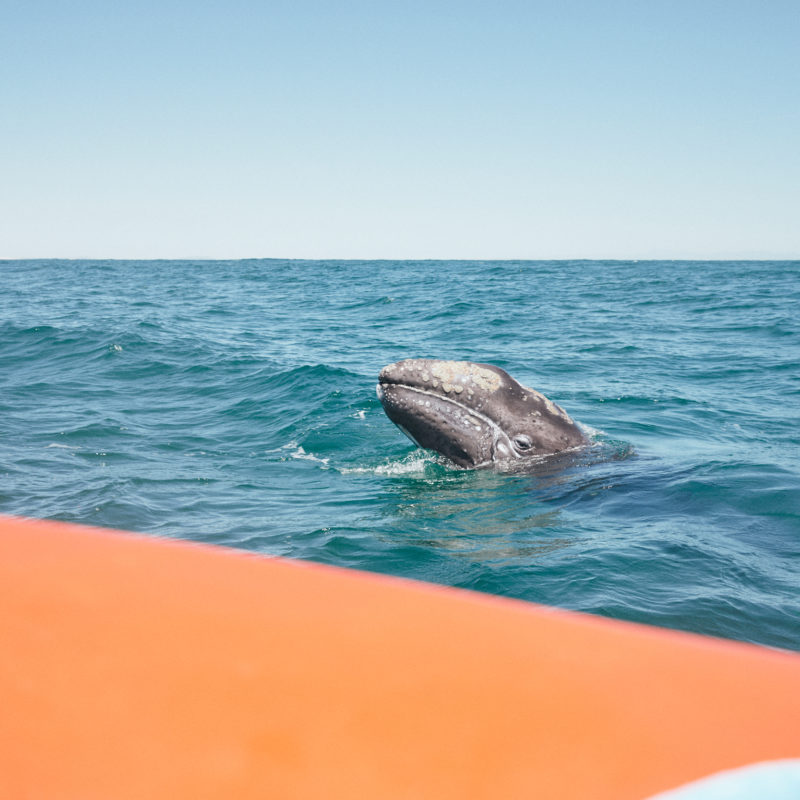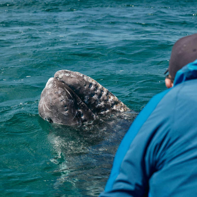 One of the biggest draws of San Ignacio Lagoon is the ability to get close to gray whales, and we mean close. The gray whale calves, in a show of playfulness and trust, come right up to the whale watching boats. The curious, puppy-like giants spin in the water, spout, roll on their backs, and spyhop, while their protective mothers stand watch at a distance. There is nowhere else in the world where whales seek this type of human interaction, and it is a deeply moving experience.