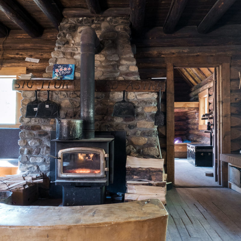Six miles and more than three hours later, I emerge in a meadow ringed by peaks, where a big wood cabin sits just below the treeline, smoke wafting from its chimney. Inside, a woodstove glows in the dim light, and a couple lounges on benches, absorbed in their books as the late afternoon light slants through the windows.