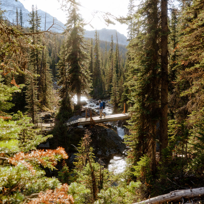 The next morning I drive back toward Calgary. But instead of heading straight to the airport, I turn west when I reach the Trans-Canada Highway just north of Lake Louise and cross the border into British Columbia and its less famous Yoho National Park. Established one year after Banff in 1886, Yoho is considerably smaller, with about 500 square miles of grand lakes, thunderous falls, and mountain heights. I park at a day-use area near the plunging ribbon of 833-foot-high Takakkaw Falls, grab a rucksack weighed down with food and supplies, and set out for the 78-year-old Stanley Mitchell Hut. The Alpine Club of Canada manages an entire network of these communal, hike-in cabins tucked deep in the Rockies, pairing pure isolation with relative ease of access.