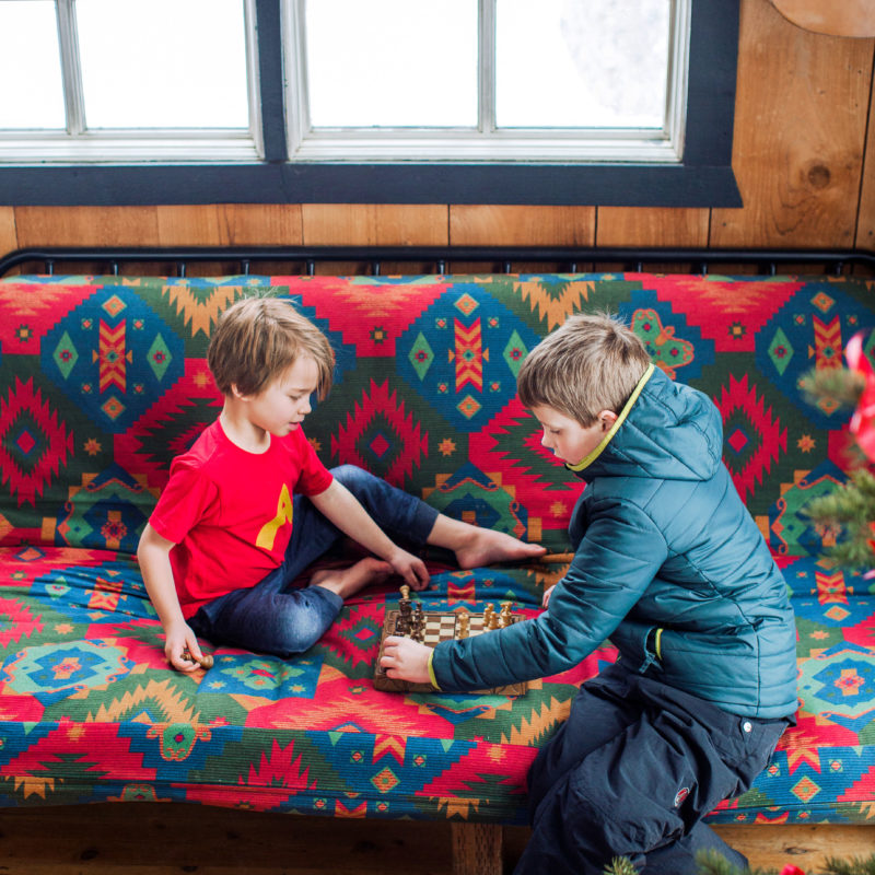 The lodge begins to glow against the blue dusk as we head inside for hot drinks. Colorful maps and a few rows of bookshelves, one made from vintage skis, brighten the walls. A woodstove the size of a washing machine quietly hums, logs popping in its orange interior. The kids quickly convert one of the dining tables into an art station of colored pencils and paper, and the adults take over another table with the cheese, crackers, warm red wine, and cold beers we packed in.
