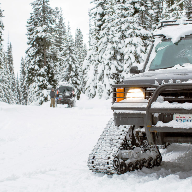 If we had come here to simply slow down, this would be a good start. The Land Rover is only going about 10 miles an hour, bouncing on tank-like cat tracks up a snowy road. Towering firs draped in snow line the way and occasionally open to reveal 50-mile views into Washington State’s powdery Cascade Range. Snow slides off the boughs, the tiny flakes so cold and dry they sparkle and float against the crisp sky. It looks like that carefree opening scene to every winter wilderness movie—you know, just before things go horribly wrong. Fortunately for us, the easygoing air persists throughout our trip.
