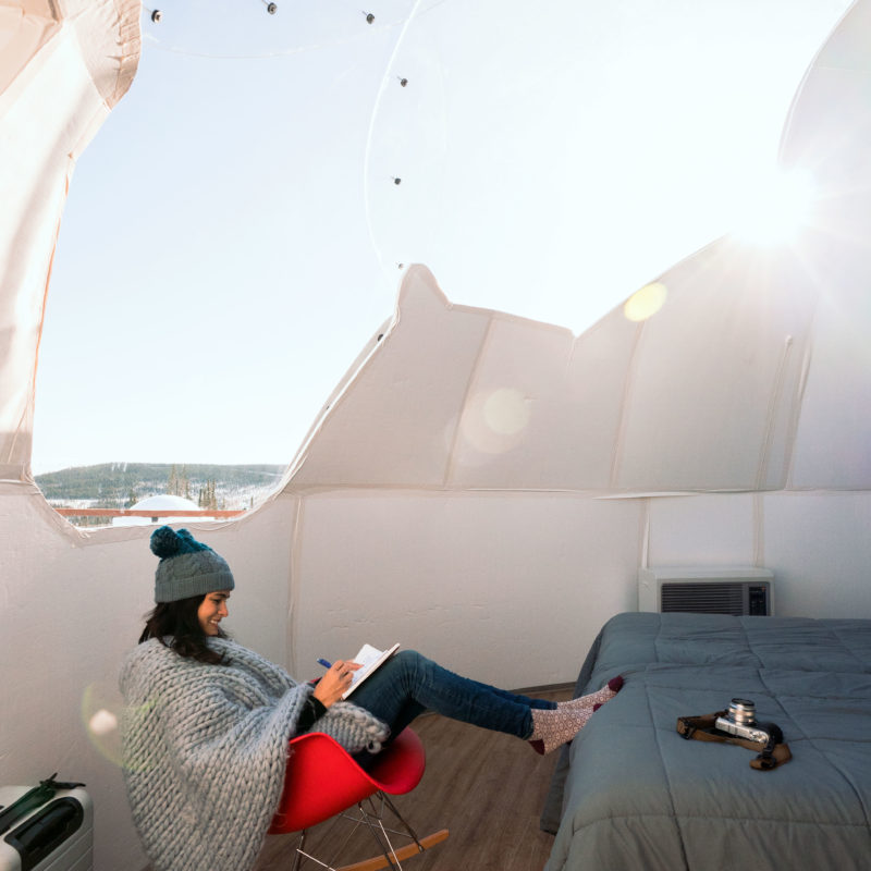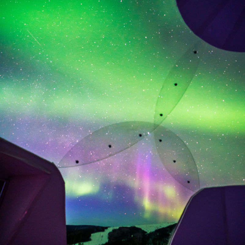 The wind picks up, so we retreat to our bubble. It’s only midnight and, judging by the way things are going, we know to expect a rainbow of colors in the early morning hours, prime time for viewing auroras. Lying supine on our twin beds pushed together, we gaze up, marveling at the distinct sensation of being suspended inside the aurora itself. This goes on for as long as our tired bodies can muster—until eventually we drift off into sleep, our faces turned toward the light.
