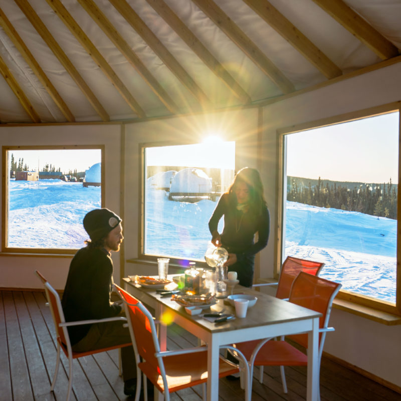 By the time we roll into the communal yurt for breakfast, the staff has already laid out coffee. It’s a beautiful morning, the sun beating down on skinny trees that are sweating off the overnight frost. For a trip that’s all about what you see and experience at night, we hadn’t considered how to fill 13 hours of daylight.