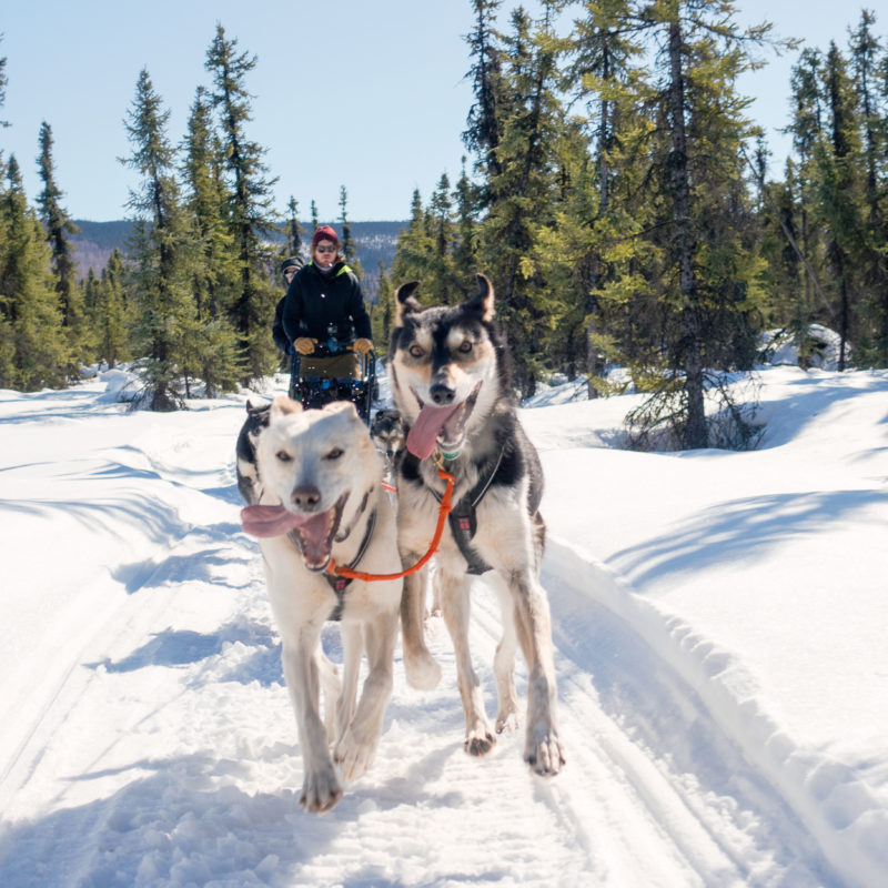 We go with a dogsledding and snowshoeing combo. Our guide is Iditarod musher Dave Turner, whose grand entrance takes him down Suicide Hill, a sharp incline dubbed for its dicey history with local daredevils. After a quick introduction to his team of eight sled dogs, I awkwardly squat on the runners and dash through the snow. The trim canines are in turbo mode with paws in sync and tongues out while I death-grip the handlebar. At some point I stop pretending I’m in control, and when we squeeze through narrow trails lined with stunted spruce, I feel pure joy. This is the most snow I’ve ever seen.