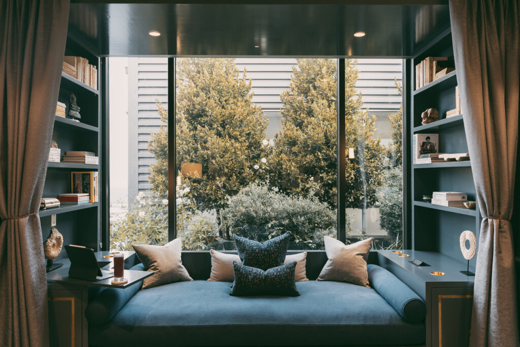 You arrive to a private gated entrance just outside the LAX main airport, and immediately are shuffled off to what’s the most bespoke, white-glove treatment you’ll ever receive at an airport. The first thing you’ll notice upon arrival at the main salon area is the design. The space looks more like a luxe hotel lobby than an airport lounge, with brass Art Deco fixtures, cozy azure velvet couches, and a mirrored bar adorned with mid-century modern stools. If you really want some privacy, you can splurge on a private suite, which offers panoramic views of the tarmac, allowing you to watch the planes gracefully take off from a vantage point like no other.
