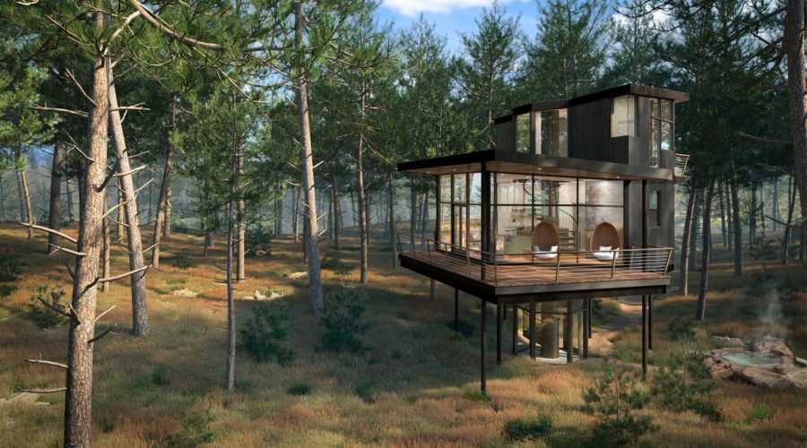 The property’s four Tree Hauses are elevated 15 feet off the ground, each offering 1,030 square feet of luxury living space spread across two stories accessible via a spiral staircase. Floor-to-ceiling windows and two separate decks provide stunning views of the surrounding forest. And of course, there is the hot tub—built into the ground below—beckoning visitors with the allure of open-air relaxation.