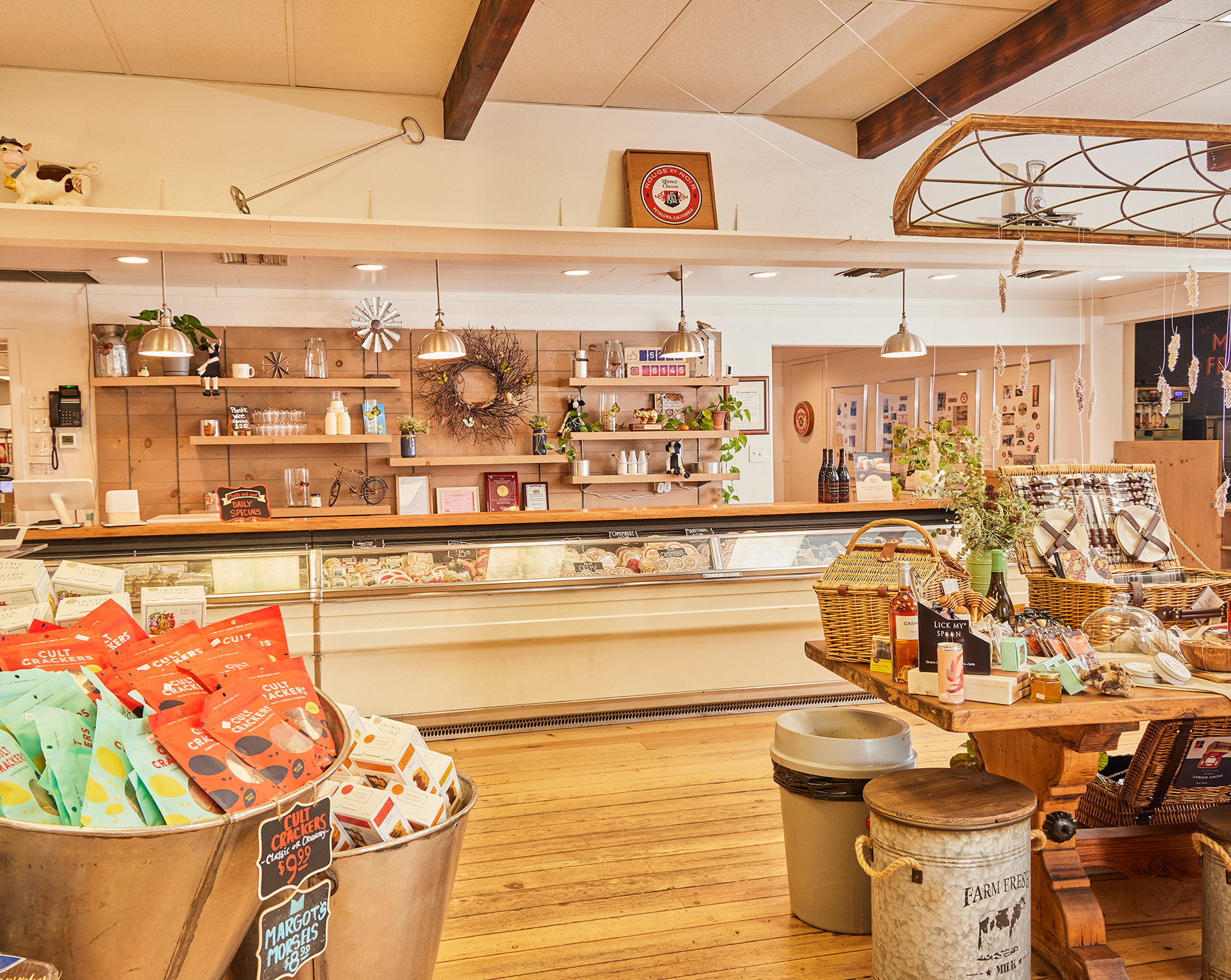 Marin French Cheese Co. is the country’s oldest cheese company, operating at its location in Marin County since 1865. Marin French Cheese Store and Picnic Grounds are both a community favorite and a tourist destination. The company’s storefront, located on the border of Petaluma and Sonoma, offers cheese-lovers an experience unlike any other. This stunning property is as much a part of Marin French Cheese Co. as the cheese itself, and home to a herd of cows, bee boxes, a pig farm, pasture-raised chickens, a vegetable garden, an elementary school, and a fire station built near the main pond.
