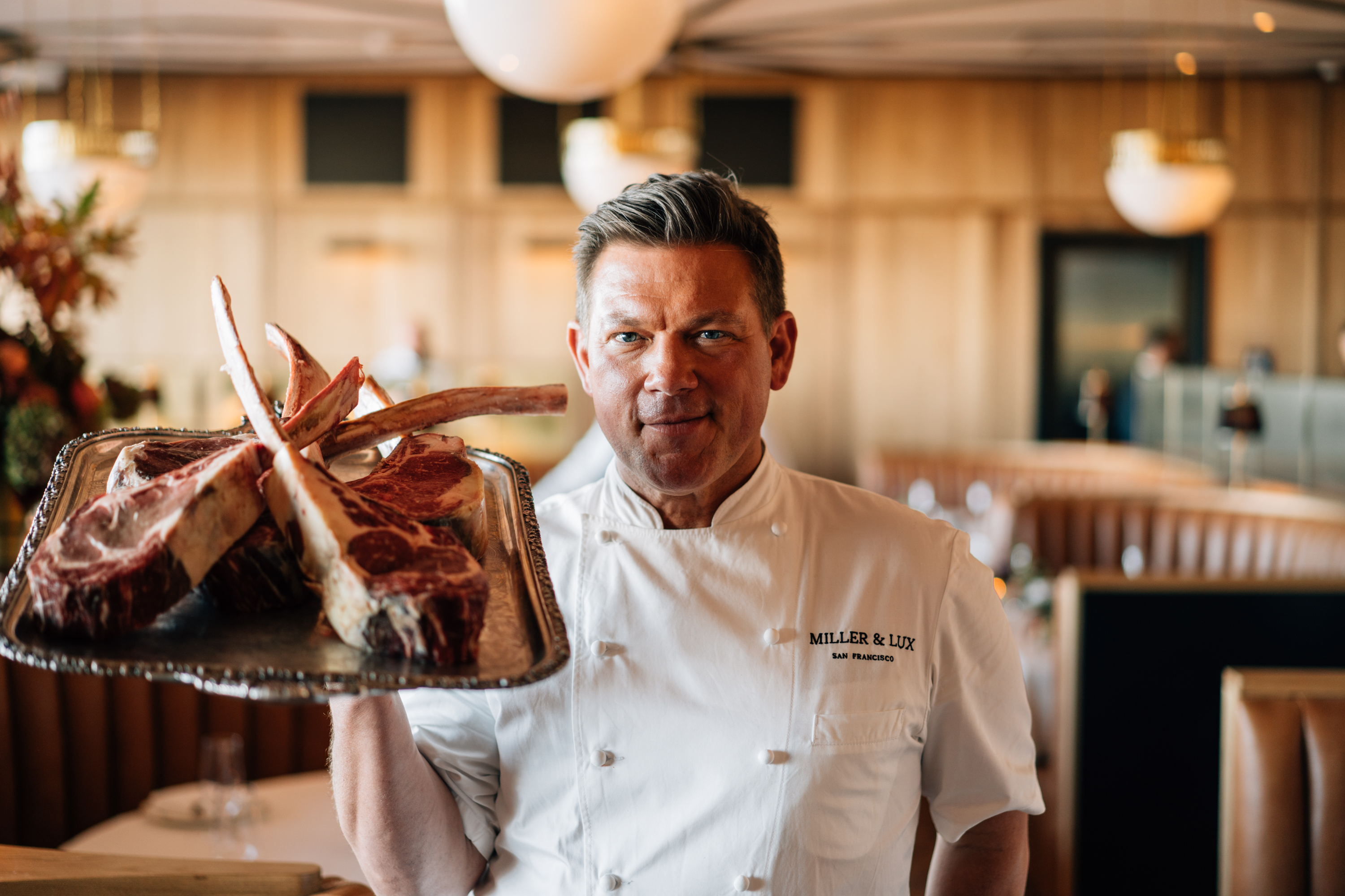 Miller & Lux transports guests to a nostalgic atmosphere of mid-century California glamour. Owned by Chef Tyler Florence and located in San Francisco’s stunning Chase Center, this timeless yet dramatic Ken Fulk-designed setting dazzles and delights. Plush leather banquettes—every one designed to be the best seat in the house– are perfect for taking in the bayside views. Dynamic floor-to-ceiling columns, with brass and hand-scraped hickory arches, punctuate the space. Elegant gueridon carts roam the dining room with Champagne, dessert and intimate tableside performances featuring the signature Caesar salad and Dover Sole. The downstairs bar enchants imbibers with bespoke cocktails and glittering crystal chandeliers. Pops of blue play into the Warriors colors, while charred woods and oxblood hues emulate the premium dry-aged steaks on the old-school broilers. From the celebratory vibes and evocative interior to the refined service, dinner at Miller & Lux is an experience unlike any other in San Francisco today.