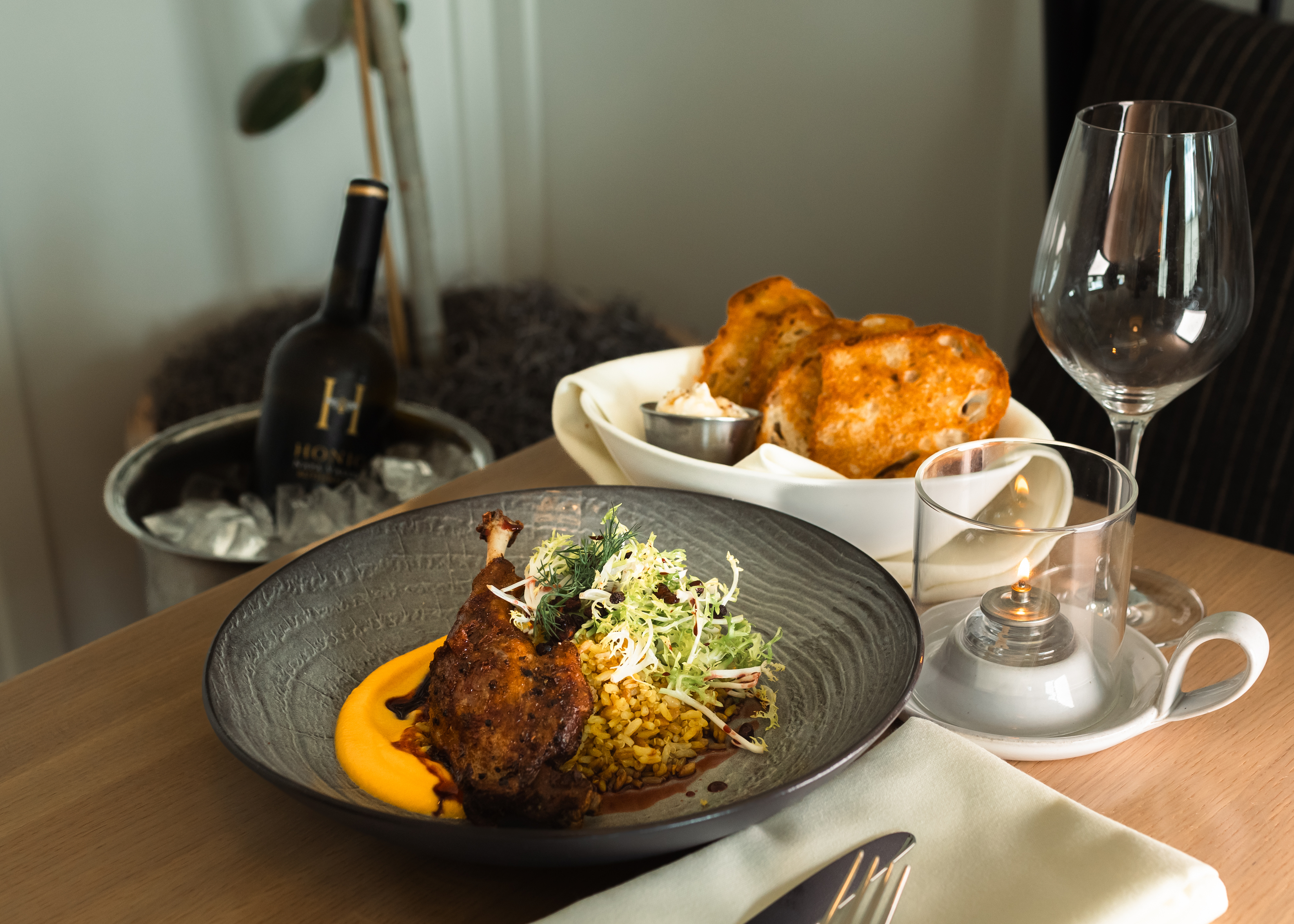 The embodiment of California’s Central Valley is captured in Merced’s fine dining restaurant, Rainbird. Located within the historic El Capitan Hotel the restaurant features well curated and thought-provoking menus that celebrate the very best of the season. The name, Rainbird, pays homage to our rich agricultural region and refers to a bird known to sing before rain signaling a forthcoming bountiful harvest. The restaurant seats 62 guests in the dining room.