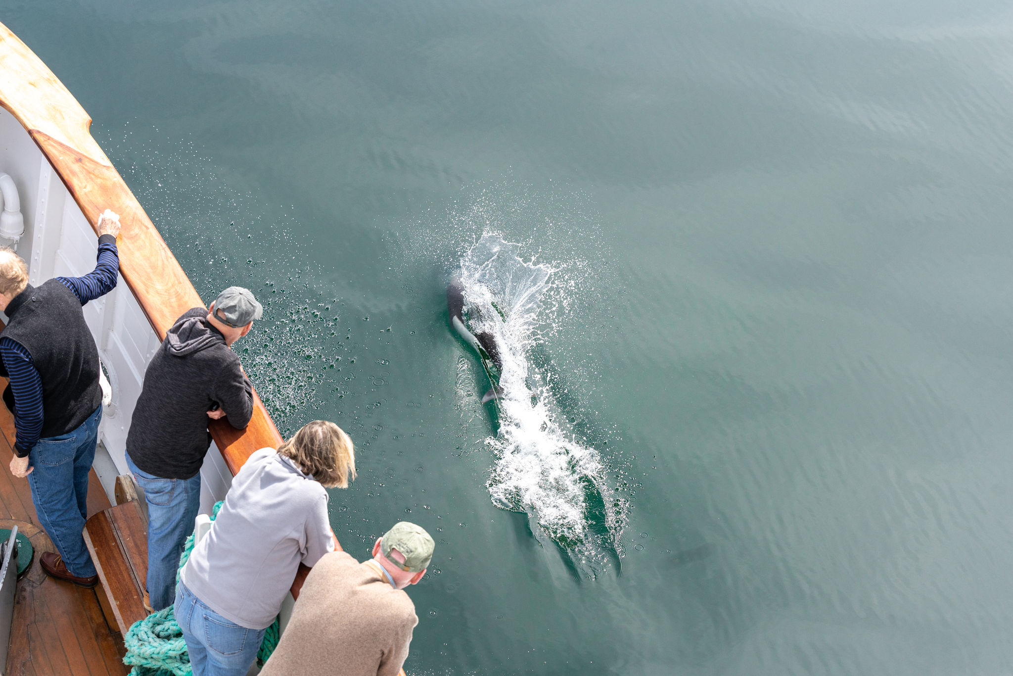 Passengers enjoy watching for whales while the ship moves amongst the water